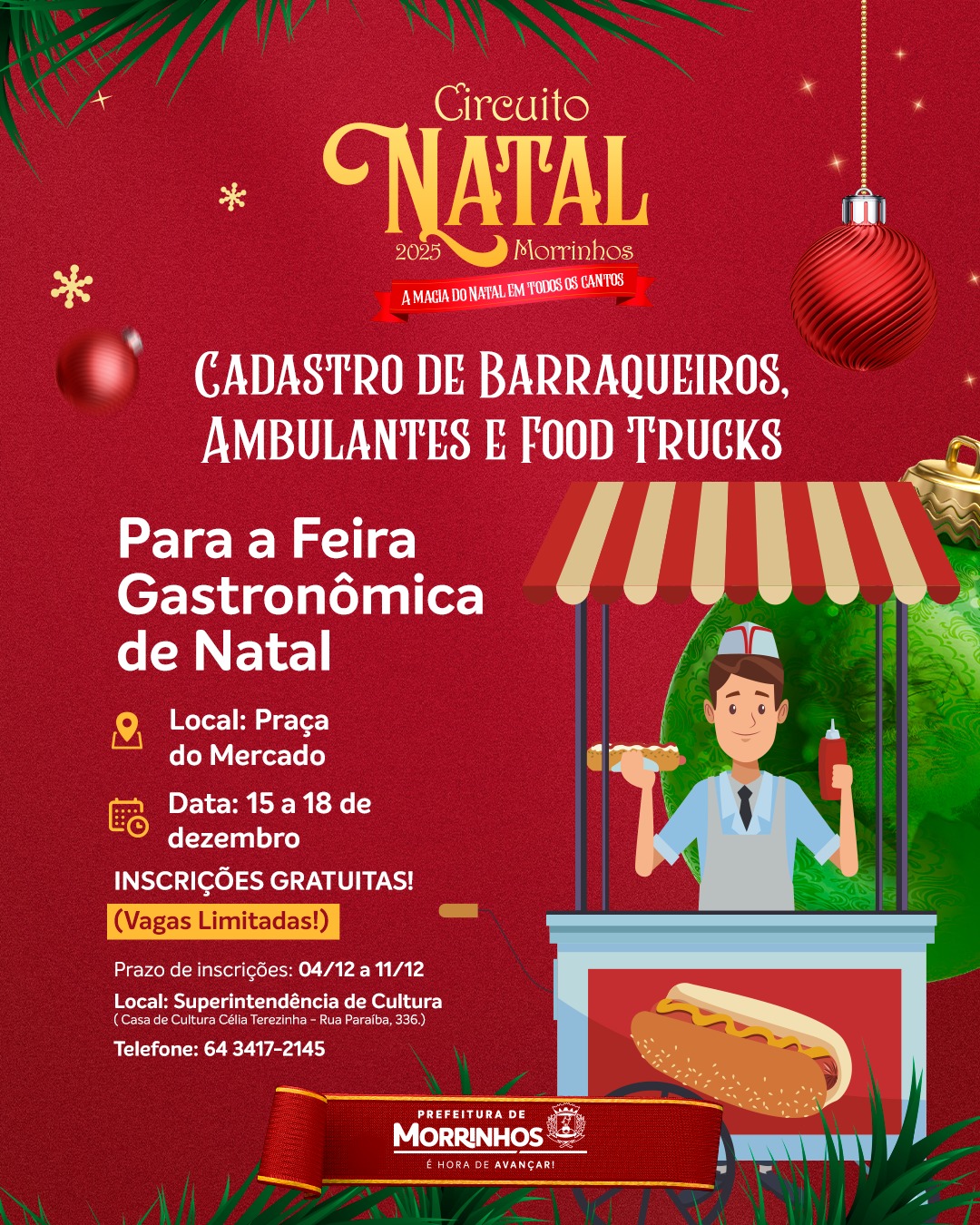 Gabriela Amaral A Prefeitura de Morrinhos, por meio da Superintendência de Cultura, informa que está aberto o cadastro gratuito de barraqueiros, ambulantes e food trucks interessados em participar da Feira Gastronômica de Natal, que ocorrerá de 15 a 18 de dezembro, na Praça do Mercado. A iniciativa integra as ações da Administração Municipal para valorizar … Ler mais