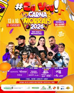 A Prefeitura de Morrinhos promove, entre os dias 13 e 16 de fevereiro, a edição 2026 do Carna Morrais, evento que integra o calendário oficial do município e deve receber público estimado em mais de 30 mil pessoas ao longo de quatro dias no Lago Recanto das Araras. Com início das atrações noturnas a partir das 20 horas, a programação reúne artistas de projeção nacional, ações de segurança pública, atividades para famílias e arrecadação de alimentos para a rede de assistência social.